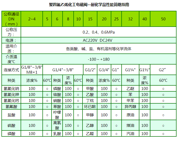 聚四氟乙烯化工電磁閥具有優(yōu)異的耐腐蝕性能,對(duì)所有的常用化學(xué)品都呈惰性。幾乎可以抵抗所有化學(xué)介質(zhì)(包括濃硫酸和王水)。具有優(yōu)異的耐熱性能,應(yīng)用溫度為-100~180℃,材料可長(zhǎng)期在230~260℃下工作。特別適合腐蝕嚴(yán)重、溫度高且化學(xué)品不允許與潤(rùn)滑劑接觸的環(huán)境。