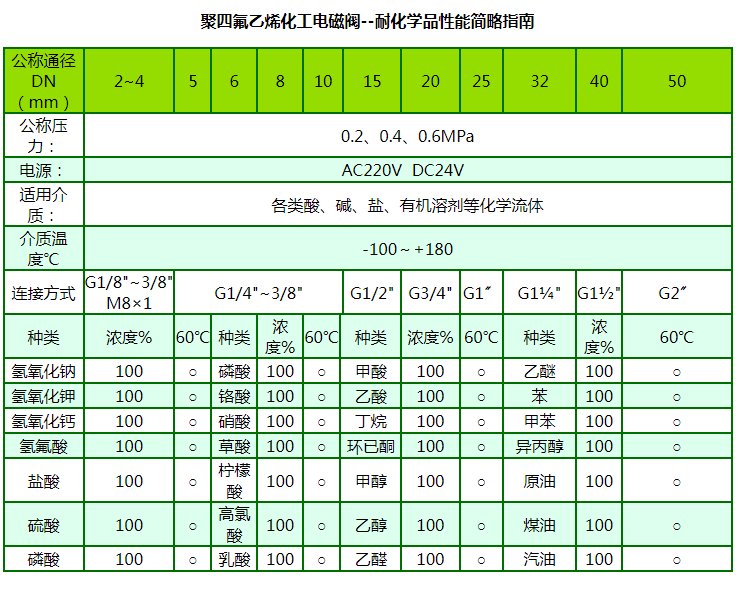 聚四氟乙烯化工電磁閥具有優(yōu)異的耐腐蝕性能,對所有的常用化學(xué)品都呈惰性。幾乎可以抵抗所有化學(xué)介質(zhì)(包括濃硫酸和王水)。具有優(yōu)異的耐熱性能,應(yīng)用溫度為-100~180℃,材料可長期在230~260℃下工作。特別適合腐蝕嚴(yán)重、溫度高且化學(xué)品不允許與潤滑劑接觸的環(huán)境。