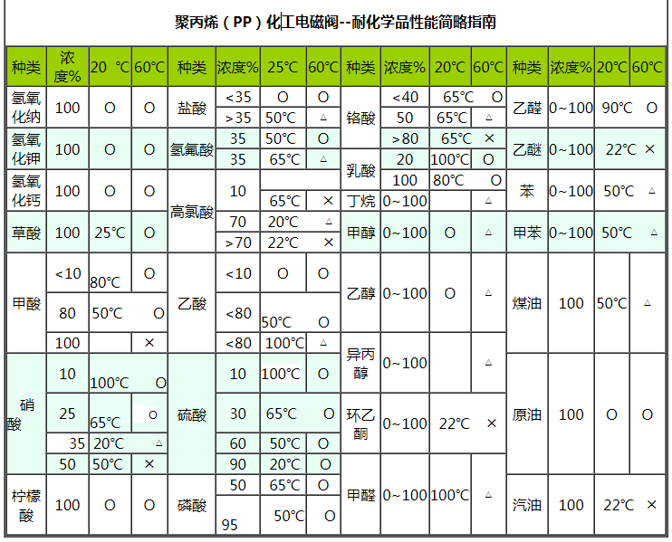 聚丙烯(PP)化工電磁閥具有優(yōu)良的耐腐蝕性能,在80℃下能耐除氧化性外的一般無(wú)機(jī)酸、堿、鹽、氣體、水等的腐蝕。它對(duì)極性有機(jī)溶劑和強(qiáng)極性的羧酸、醇類有較大的抗溶劑能力。少數(shù)氧化性酸在濃度較高時(shí)對(duì)其有較大的腐蝕作用。有一定的剛度和強(qiáng)度,適用溫度為-0~120℃。