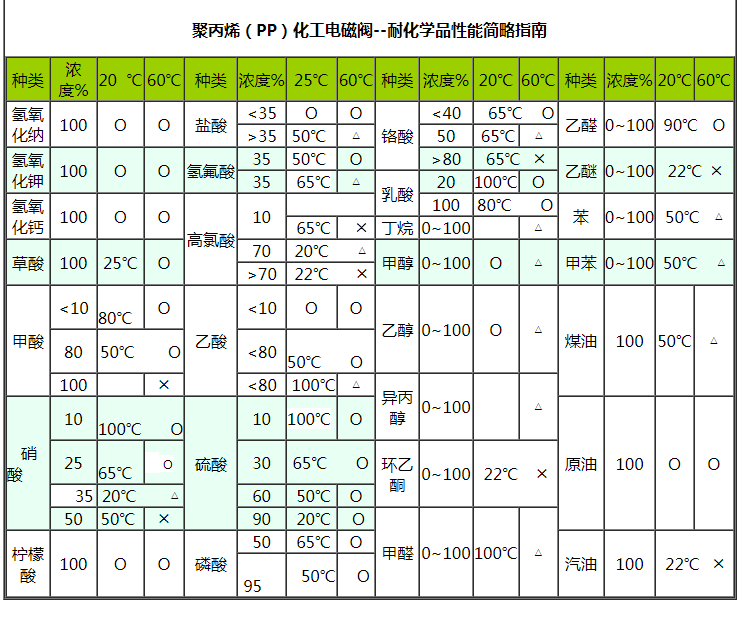 聚丙烯(PP)化工電磁閥具有優(yōu)良的耐腐蝕性能,在80℃下能耐除氧化性外的一般無機(jī)酸、堿、鹽、氣體、水等的腐蝕。它對極性有機(jī)溶劑和強(qiáng)極性的羧酸、醇類有較大的抗溶劑能力。少數(shù)氧化性酸在濃度較高時對其有較大的腐蝕作用。有一定的剛度和強(qiáng)度,適用溫度為-0~120℃。